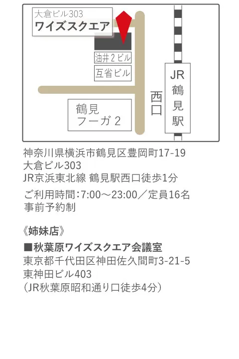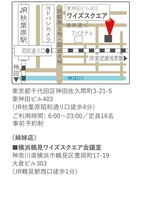 秋葉原ワイズスクエア会議室はJR秋葉原駅昭和通り口から徒歩4分で最大16名収容。横浜鶴見ワイズスクエア会議室はJR鶴見駅から徒歩1分、京急鶴見駅から徒歩4分と、いずれもアクセスの良さが際立ちます。